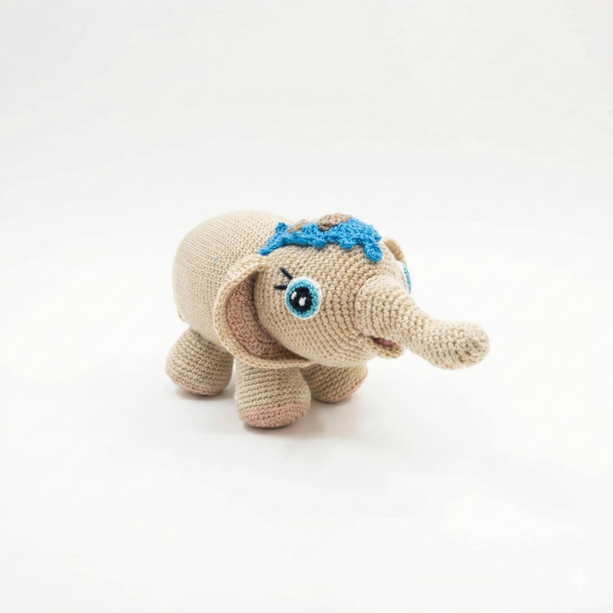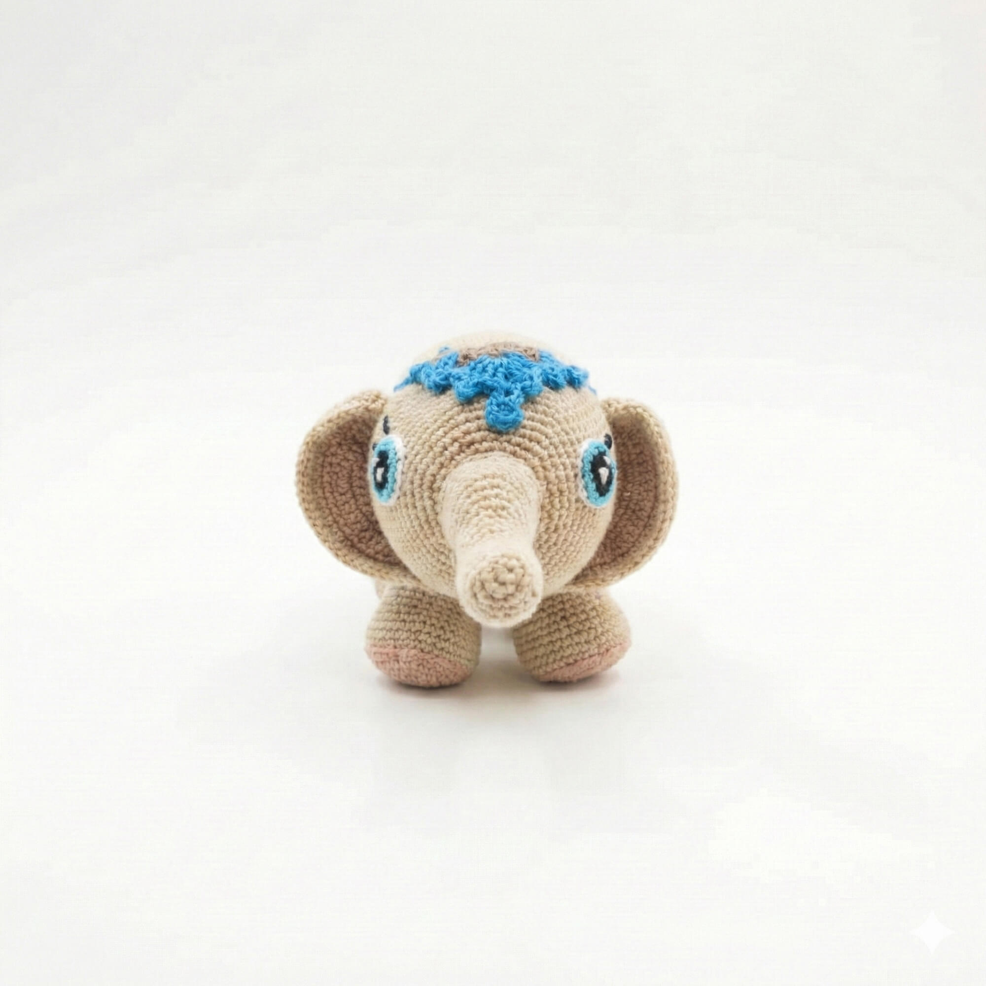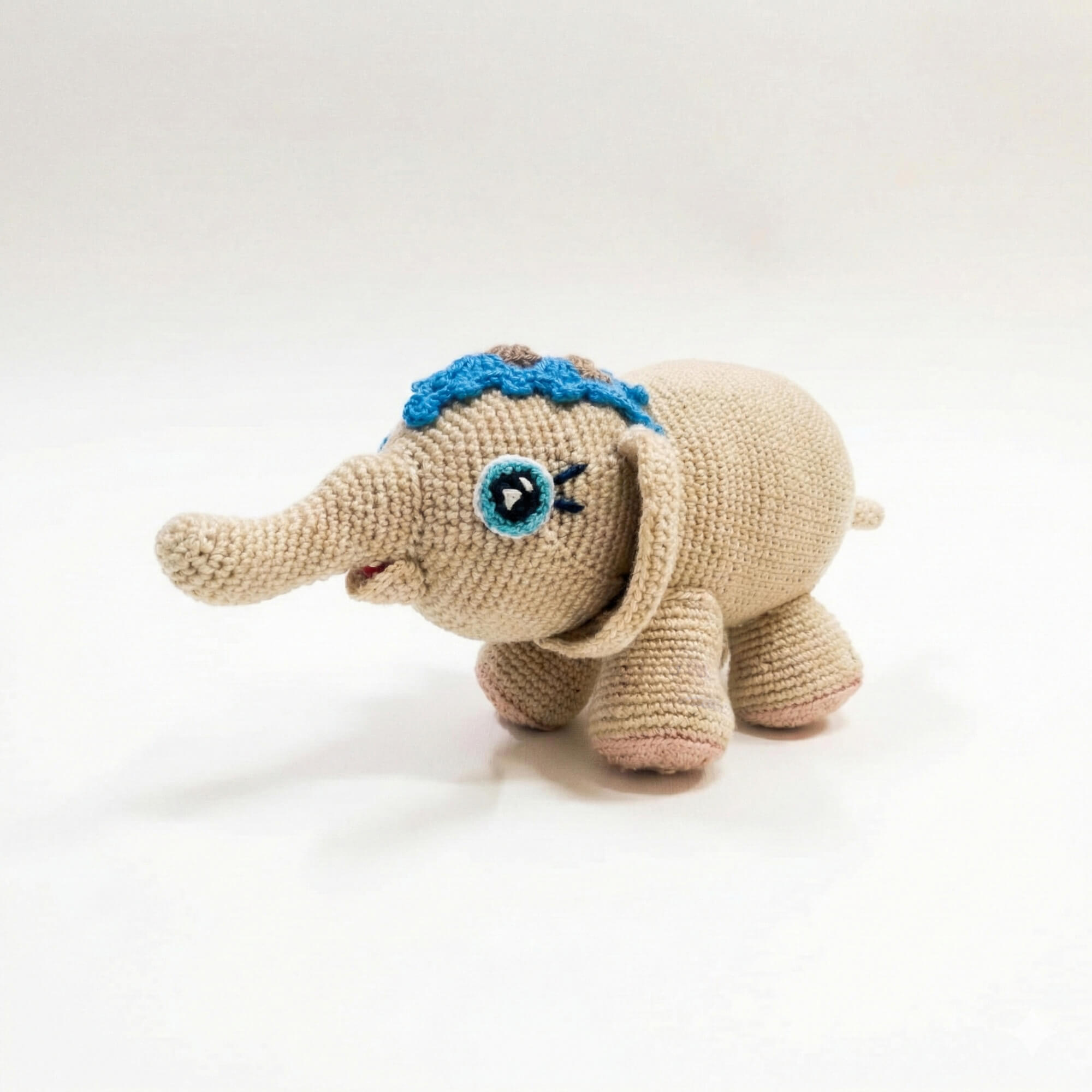 Tamamen el emeği ile sevgiyle örülen bu Amigurumi Fil, çocuklarınızın odasına neşe, uykularına huzur getirmeye geliyor. Başındaki zarif mavi dantel işlemesiyle klasik oyuncaklardan ayrılan bu özel tasarım, hem şık bir dekoratif obje hem de güvenli bir oyun arkadaşıdır.