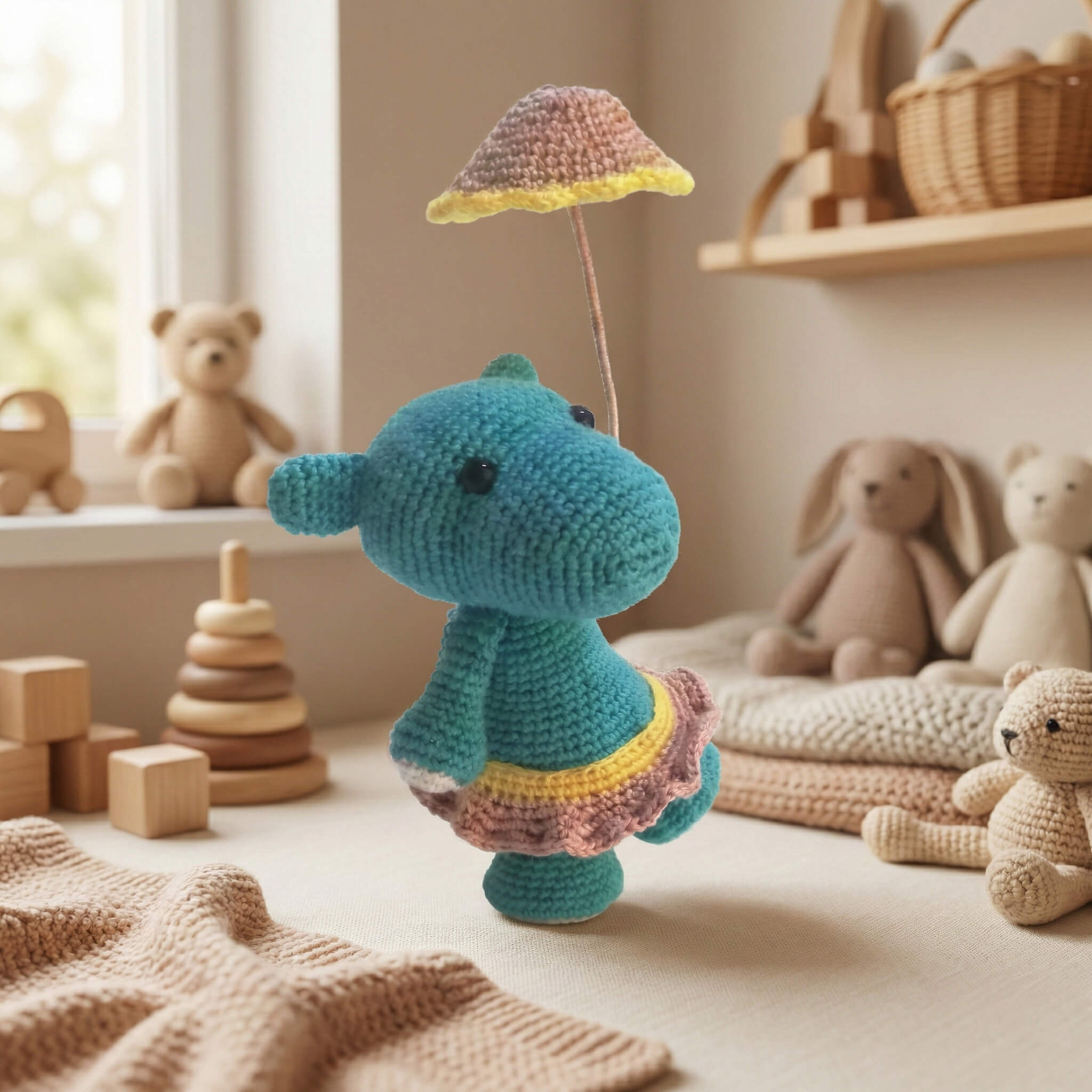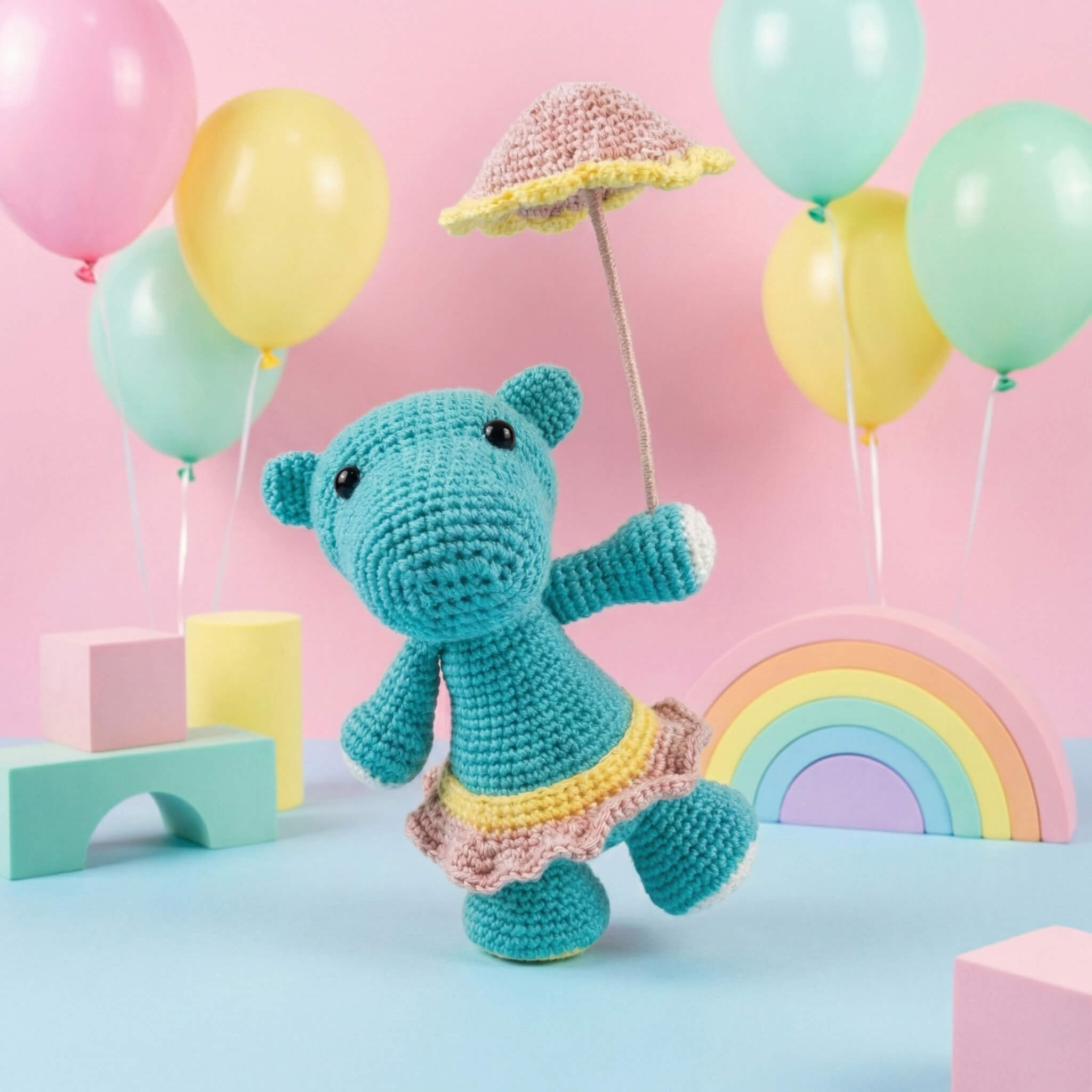 Zarafet ve neşe bir arada! Tek ayağının üzerinde dengede duran ve elinde şık şemsiyesiyle dikkat çeken bu el yapımı amigurumi hipopotam, hem çocuklar için eşsiz bir oyun arkadaşı hem de eviniz için masalsı bir dekorasyon objesidir.